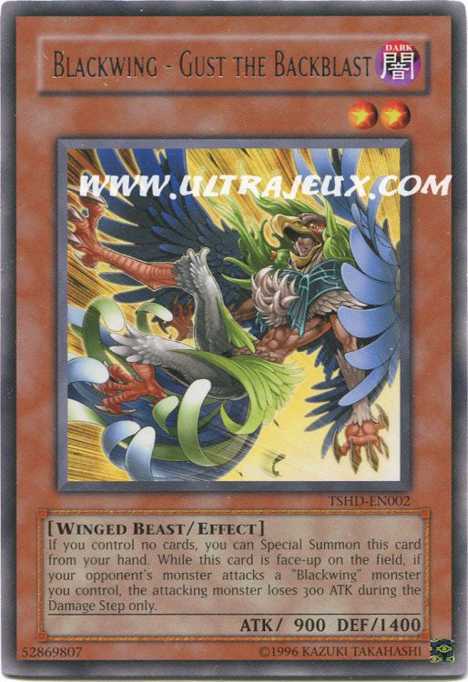 IndisponibleSi vous ne contrôlez aucune carte, vous pouvez Invoquer Spécialement cette carte depuis votre main. Lorsque cette carte est face recto sur le Terrain, si le monstre de votre adversaire attaque un monstre "Aile Noire" que vous contrôlez, le monstre attaquant perd 300 points d'ATK uniquement durant la Damage Step.