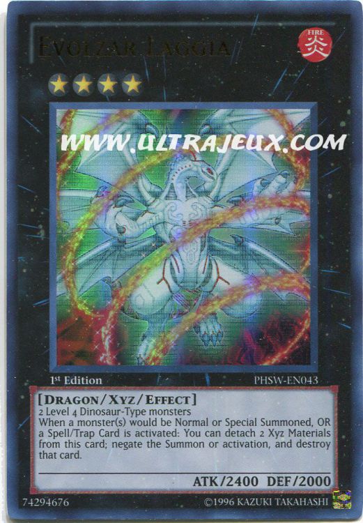 Indisponible2 monstres de Type Dinosaure de Niveau 4 Lorsqu'un ou plusieurs monstres vont être Invoqués Normalement ou Spécialement, OU une Carte Magie/Piège est activée : vous pouvez détacher 2 Matériels Xyz de cette carte ; annulez l'Invocation OU l'activation, et détruisez le monstre OU la carte.