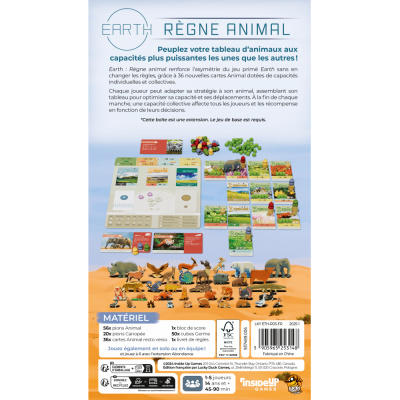 Continuez de créer votre île, un tableau de 16 cartes, en y ajoutant 36 cartes Animal et les 56 magnifiques pions qui s’y rapportent. Ceux-ci apportent de l’asymétrie entre les joueurs avec les capacités individuelles mais également du renouvellement dans vos parties grâce à la capacité collective de l’animal choisi. Un émerveillement et une profondeur inégalés !
